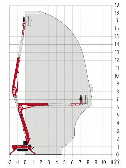 The Teupen 18GT+D Spider lifts provides a working height of 18,3 m and a maximum of 8,5 m horizontal reach. The maximum lift capacity for this Teupen is 200 kg.