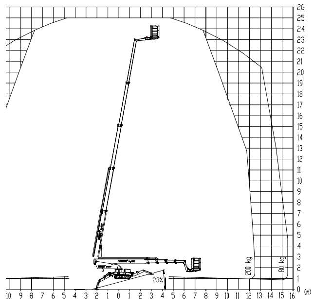The Teupen 25T Spider lifts provides a working height of 25 m and a maximum of 12 m horizontal reach. The maximum lift capacity for this Teupen is 200 kg.