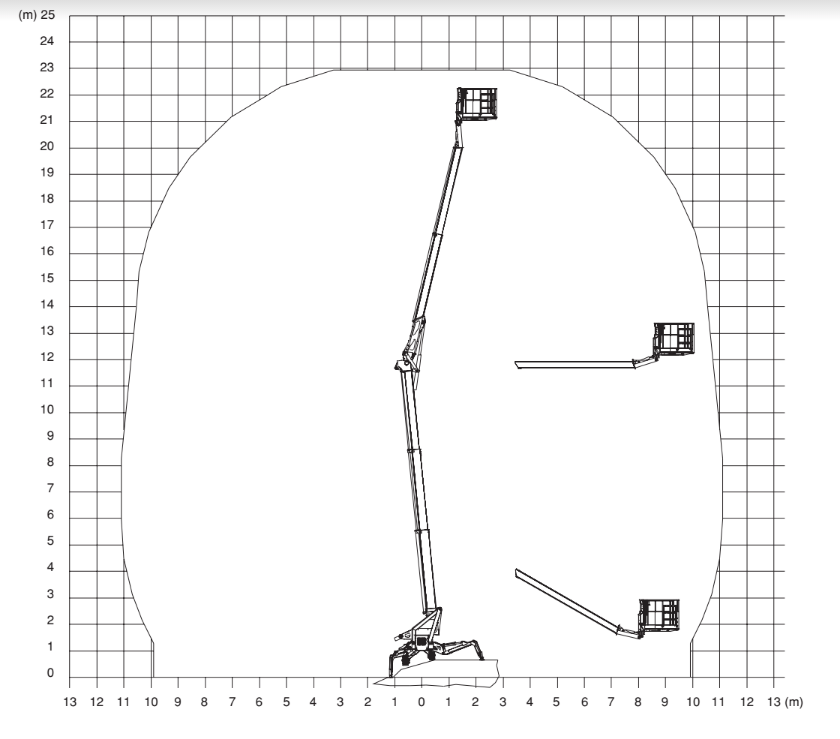 The Teupen 23GT Spider lifts provides a working height of 23 m and a maximum of 11,2 m horizontal reach. The maximum lift capacity for this Teupen is 200 kg.