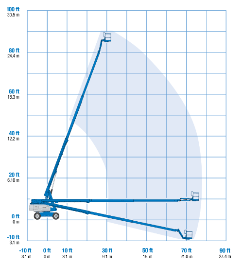 Ready to rent: our Genie S85 Telescopic boom lifts provides a working height of 27,97 m and a maximum of 22,71 m horizontal reach. The maximum lift capacity for this Genie is 227 kg.