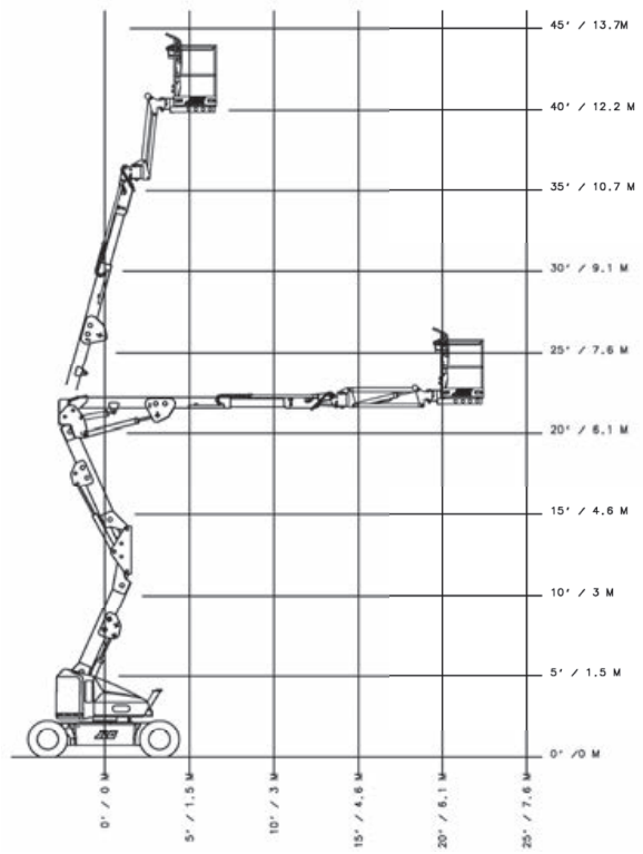 Ready to rent: our JLG E400AJP Articulated boom lifts provides a working height of 14,2 m and a maximum of 7,5 m horizontal reach. The maximum lift capacity for this JLG is 230 kg.